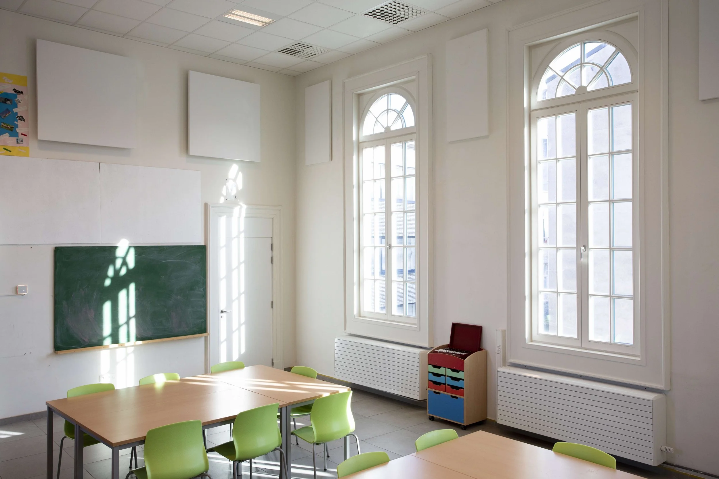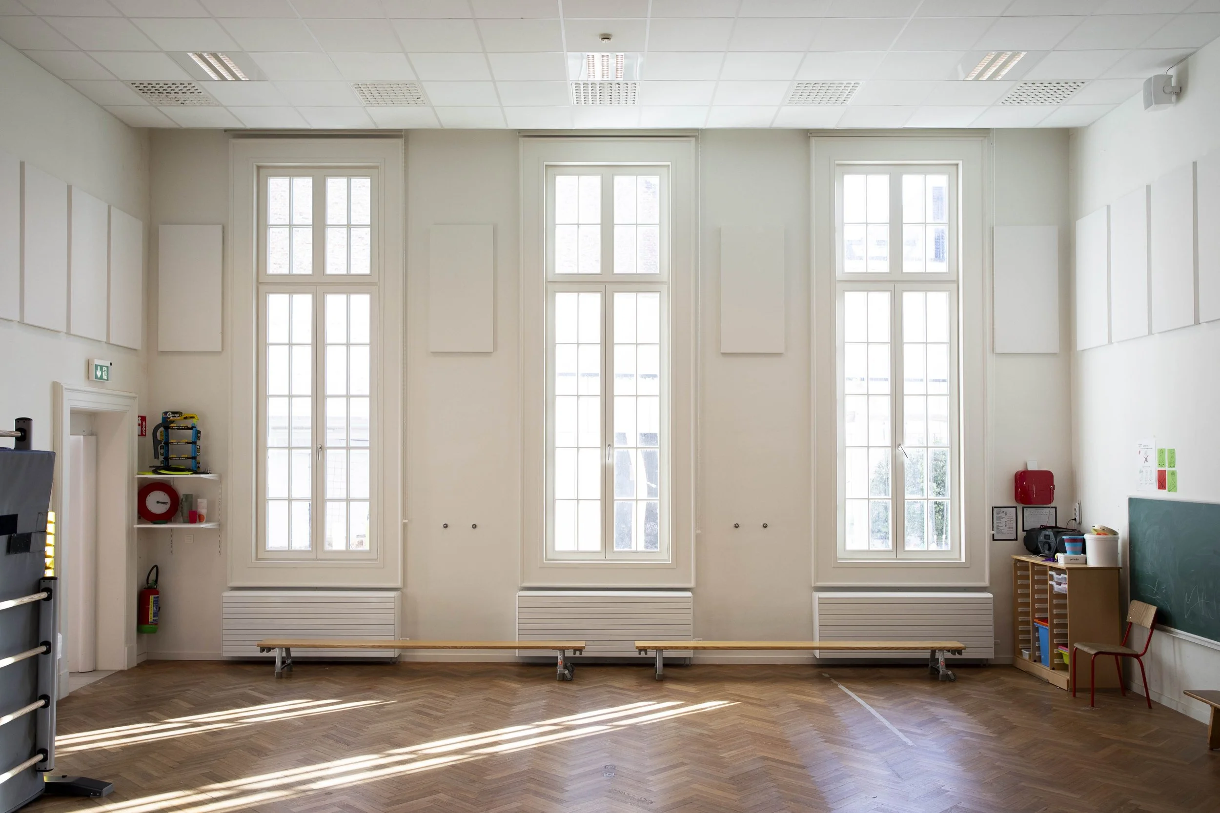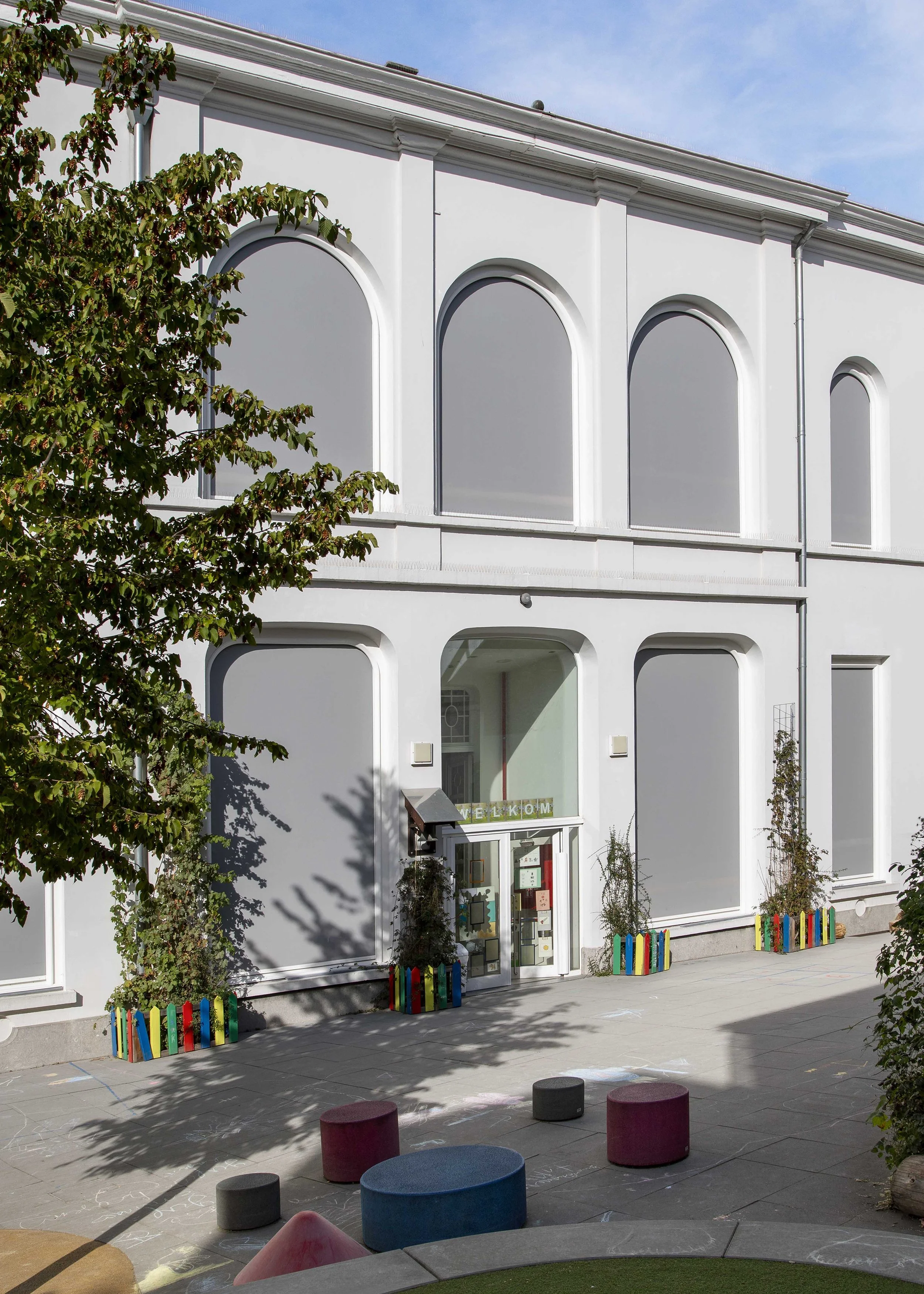 Een rijk versierde voorgevel en een eenvoudige achtergevel. Met een doorgedreven aandacht voor verfijnde detaillering van het nieuwe buitenschrijnwerk introduceren we opnieuw ornament, elegantie, reliëf en diepte in de historische gevel die doorheen de verschillende renovatiegolven werd ontdaan van zijn verfijning. Opnieuw opgetuigd zoals het was bedoeld. Zonwering tegen oververhitting, akoestisch comfort naast de speelplaats, kindveilige omgeving,… .De uitdagingen waren groot om de actueel vereiste prestaties te realiseren in een raam naar historisch model van deze omvang.